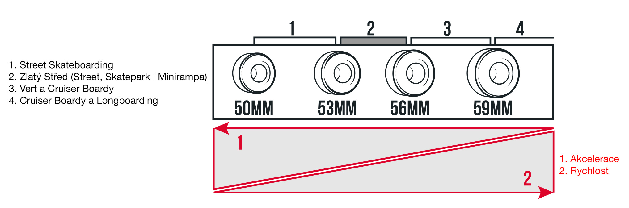 Street a Skateparky: nejčastěji kolečka od 50mm do 55mm (na street kola tvrdší, do skateparku trochu měkčí)